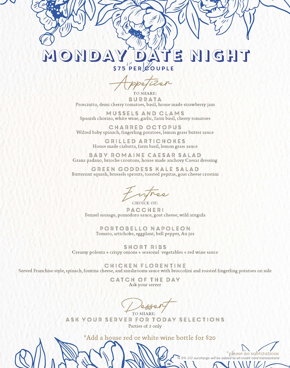 Served Franchise-style, spinach, fontina cheese, and mushrooms sauce with broccolini and roasted fingerling potatoes on side