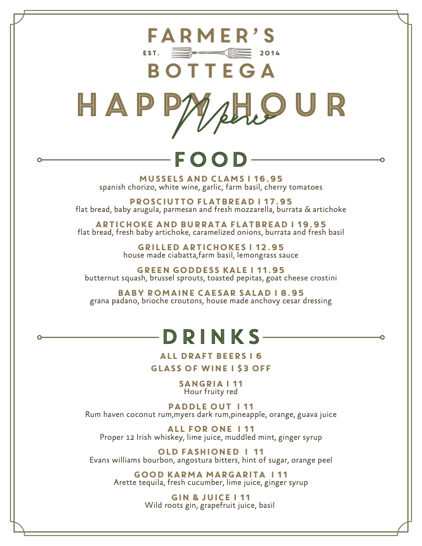 The ambiance at Farmers Bottega is designed to enhance your happy hour experience. With a cozy and relaxed atmosphere, our restaurant offers a welcoming space for friends and family to unwind and enjoy the best happy hour in Mission Hills. Whether you choose to sit at the bar, in our garden patio, or in our intimate dining area, you’ll find the perfect setting for your happy hour rendezvous.